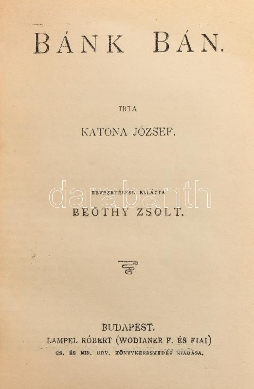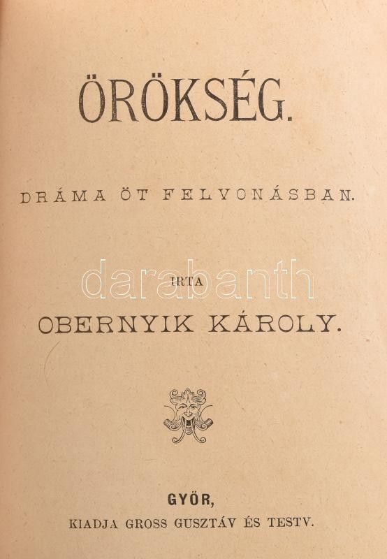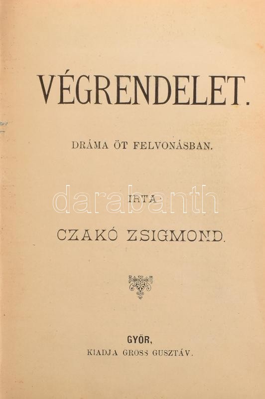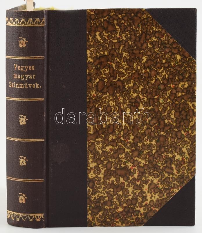 Kolligátum 10 műből: Czakó Zsigmond: Végrendelet. Dráma öt felvonásban. Győr, én.,Gross Gusztáv, 88 p.; Obernyik Károly: Örökség. Dráma öt felvonásban. Győr, é.n.,Gross Gusztáv, 82 p. Katona József: Bánk bán. Beöthy Zsolt bevezetésével. Bp., én., Lampel R. (Wodianer F. és Fiai) Rt., 108 p.; Szigligeti Ede: Liliomfi. Eredeti vígjáték, népdalokkal, zenével. Három felvonásban. Bp., 1875., Franklin, 87 p.; Hugo Károly: Bankár és báró. Szomorujáték három felvonásban. Bp., 1898., Franklin, 108 p.; 1857 Játékszini emlékkönyv 1857-re. A színművészet barátinak ajánlja Csiki György sugó. Győr, (1856.), Saurvein Géza, 32 p.; 1863 Szinházi zsebkönyv. 1863. Győr város lelkes honfiai és leányainak uj évi emlékül ajánlja a sugó. Győr, 1862., Saurvein Géza, 15 p.; 1863 Szinházi zsebkönyv. 1863. Füzér 1863-ra. A magyar színészet lelkes pártfogóinak ajánlva Nagy Sándor színtársulati sugó által. Győr, én., Saurvein Géza, 16 p.; 1863 Szinházi emlék-könyv, a szinművészet lelkes pártfogóinak ajálva. 1863. Győr, é.n., Saurvein Géza, 8 p.; Színházi emlék-könyv. 1864. October, november, december. Győrött működő Dráguss Károly igazgatása alatti szintársulat működése emlékül ajánlja Kárpáti Jenő sugó. Győr, 1864., Saurvein Géza, 15 p.; Átkötött kissé kopott félvászon-kötésben.