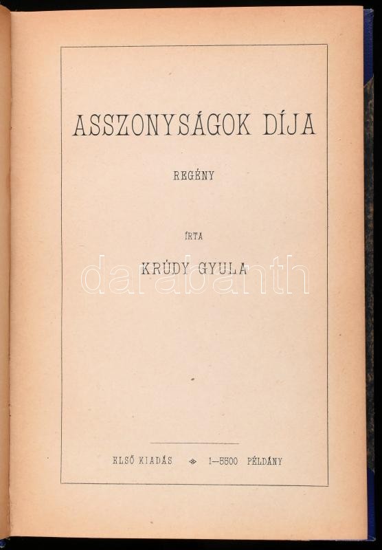 Krúdy Gyula: Asszonyságok díja. Bp., 1919, Dr. Rácz Vilmos (Hornyánszk... https://www.darabanth.com/en/414-Online-auction/414.0/Books/Books-Other-rarities~1000024/Krudy-Gyula-Asszonysagok-dija-Bp-1919-Dr-Racz-Vilmos-Hornyanszky-Viktor-ny-173plus1-p-E~II2585363