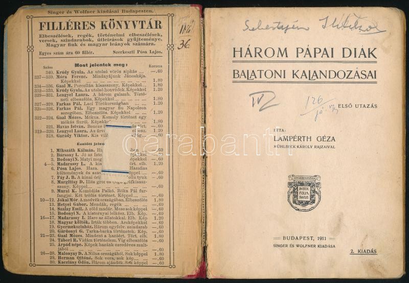 Pósa Lajos: Három pápai diák balatoni kalandozásai. Filléres Könyvtár. Bp.,1911,Singer és Wolfner. Kiadói félvászon-kötésben, kopott, sérült borítóval. Schmid Kristóf: Legszebb elbeszélései az ifjuság számára. Hazafias Könyvtár 15. sz. Bp., é.n., Stampfel-féle Könyvkiadóhivatal, 13. kötet. Kiadói illusztrált félvászon-kötés, sérült borítóval.