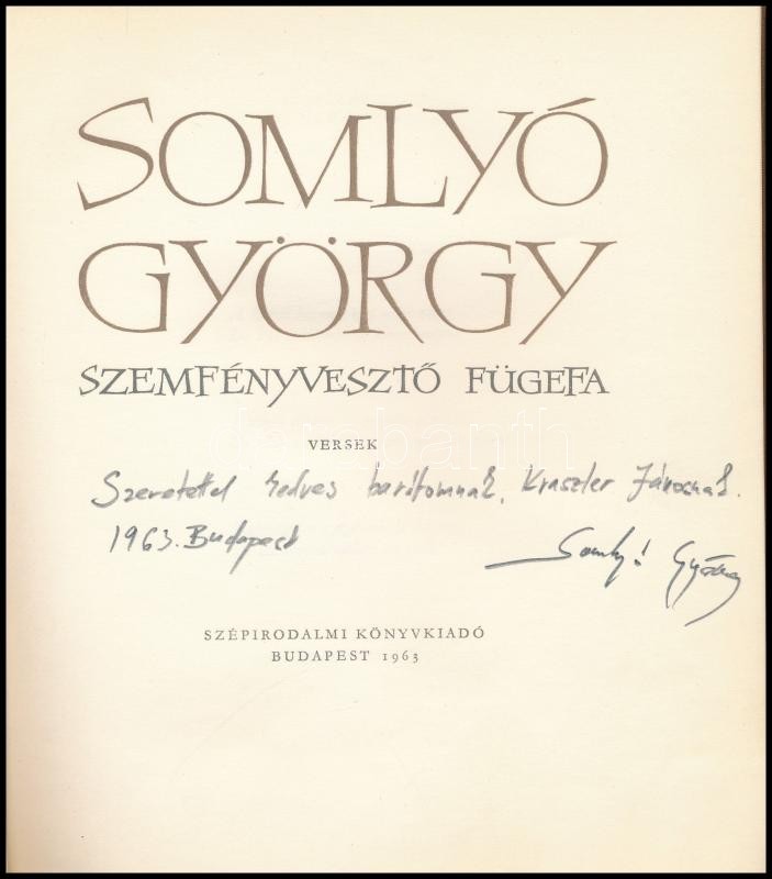 Somlyó György: Szemfényvesztő fügefa. Versek. A szerző, Somlyó György ... https://www.darabanth.com/en/414-Online-auction/414.0/Books/Books-Other-rarities~1000024/Somlyo-Gyorgy-Szemfenyveszto-fugefa-Versek-A-szerzo-Somlyo-Gyorgy-1920-2006-kolto-C3~II2588190