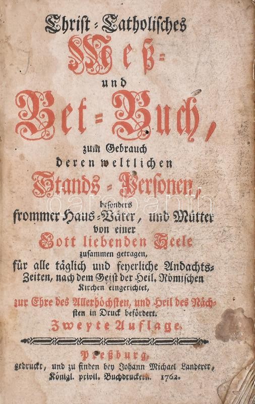 Christ- Catholisches Mess- und Bet- Buch, zum Gebrauch deren weltlichen Stands-Personen, ... Preßburg, 1762., Johann Michael Landerer, 7 sztl. lev+438 p.+5 sztl. lev+7 ( ) t. Német nyelven. Második kiadás. Korabeli egészbőr-kötésben, kopott borítóban, sérült gerinccel, kis szúette lyukakkal, kis foltokkal.