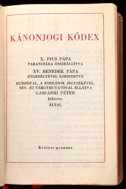 Kánonjogi kódex. X. Pius pápa parancsára összeállítva, XV. Benedek eng... https://www.darabanth.com/en/414-Online-auction/414.0/Books/Books-Religion~1000020/Kanonjogi-kodex-X-Pius-papa-parancsara-osszeallitva-XV-Benedek-engedelyevel-kihirdetve~II2587408