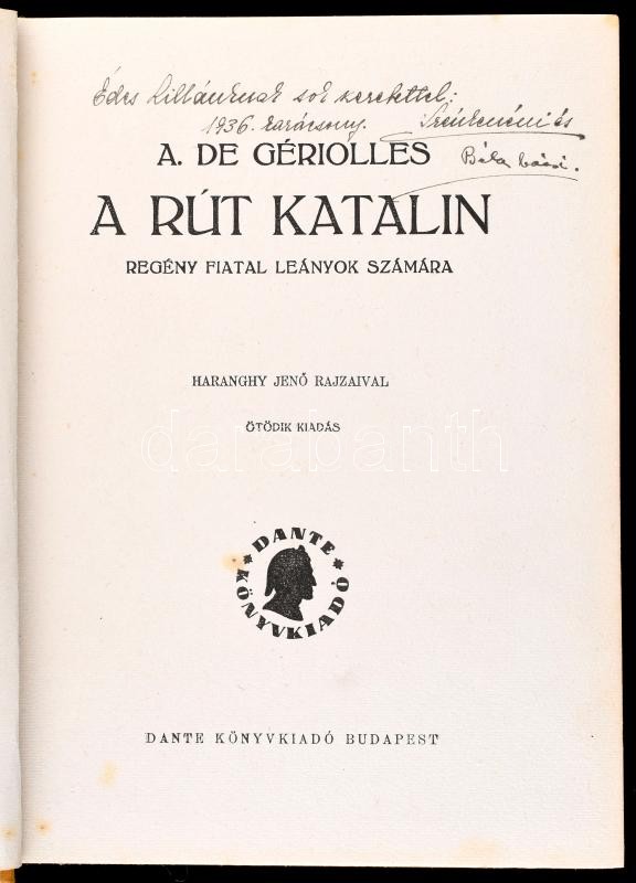 Description: A. de Gériolles: A rút Katalin. Regény fiatal leányok számára. Haranghy Jenő rajzaival. Bp., é.n. (cca 1936), Dante, 176 p. Ötödik kiadás. Kiadói aranyozott gerincű, illusztrált félvászon-kötés, kissé sérült borítóval, helyenként kissé foltos lapokkal, ajándékozási bejegyzéssel.
