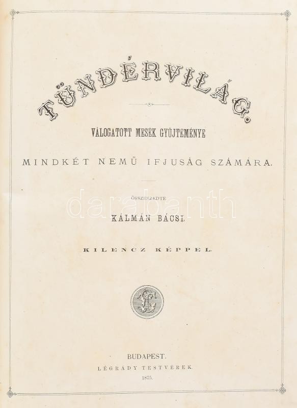 [Mikszáth Kálmán]: Tündérvilág. Válogatott mesék gyüjteménye mindkét nemü ifjuság számára. Összeszedte Kálmán Bécsi. Kilencz képpel. Bp., 1875., Légrády-ny., 1 (cÃmkép, litográfia) t.+101 p.+ 8 (litográfia) t. BorÃtó nélküli példány. Ritka!