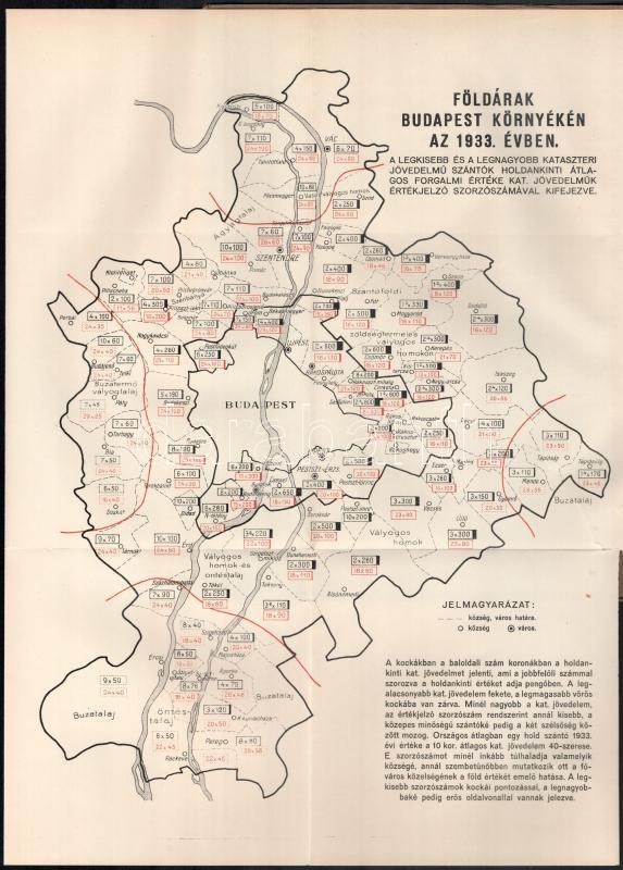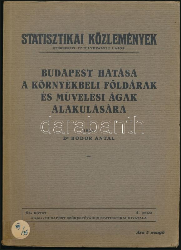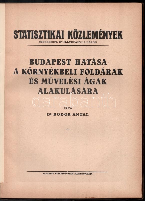 Bodor Antal: Budapest hatása a környékbeli földárak és művelési ágak alakulásra. Statisztikai Közlemények 64. kötet 4. szám. Bp.,(1934), Székesfőváros Statisztikai Hivatala. Nagyméretű kihajtható térképpel. Kiadói papírkötés, volt könyvtári példány.