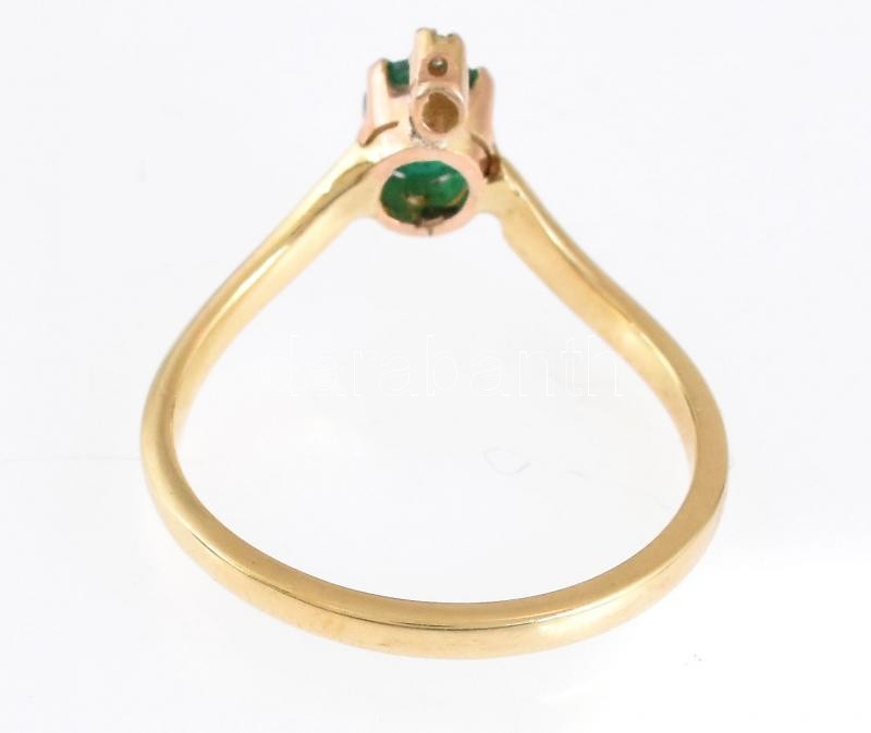 Description: Arany (Au/18k) Női gyűrű, 1db természetes smaragddal ékítve cca. 0,30ct, 1db modern csiszolású brillel ékítve cca. 0.01ct, jelzett, bruttó: 2,g, m: 52.
