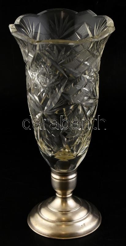 Ezüst (Ag) talpó kristály váza, csorbákkal, jelzett, m:29cm