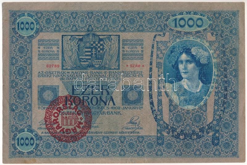 https://www.darabanth.com/en/414-Online-auction/414.0/Numismatics/Hungarian-Banknotes~2000007/1902-1000K-piros-MAGYARORSZAG-korbelyegzovel-TII-eros-papir-gyengebb-hajtasok-ket-er~II2590256