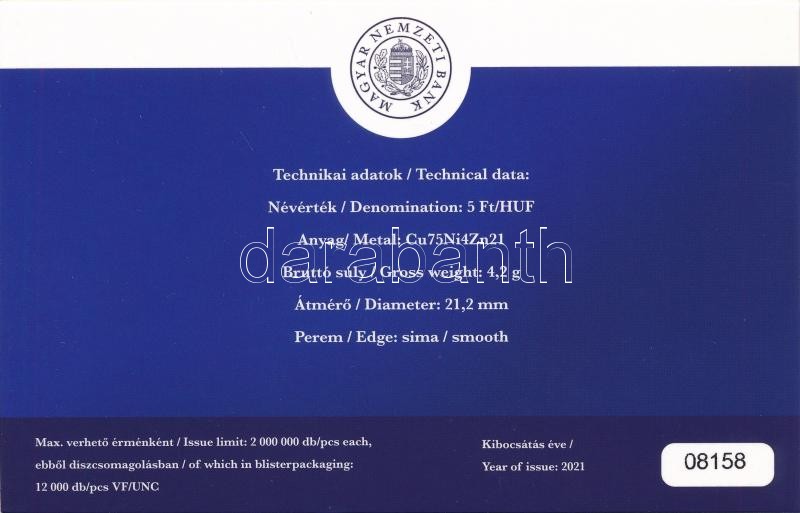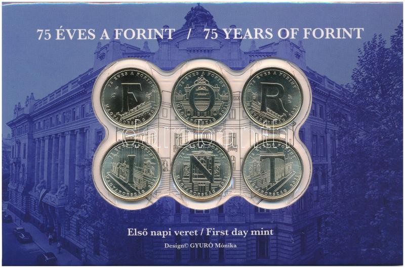 https://www.darabanth.com/en/414-Online-auction/414.0/Numismatics/Hungarian-coins-and-coins-with-Hungarian-mint-marks~2000008/2021-5Ft-Cu-Ni-Zn-75-eves-a-Forint-elso-napi-veret-6xklf-sorszamozott-emleklapon-T1~II2590835