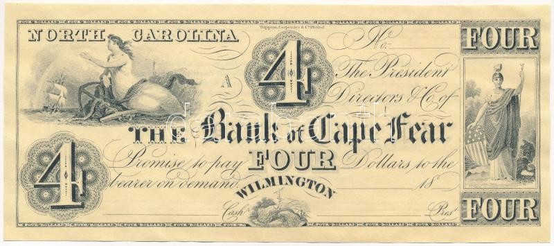 Description: Amerikai Egyesült Államok / Észak-Karolina / Wilmington 18??. 4$ hátoldalán jelzett gyűjtői másolat T:III szép papír