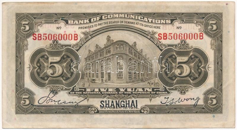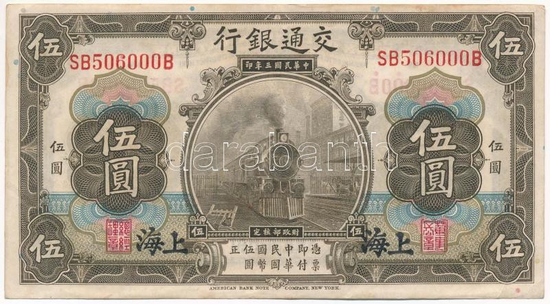 Description: Kína / Bank of Communications 1914. 5Y fekete "SHANGHAI" felülbélyegzéssel T:III szép papír