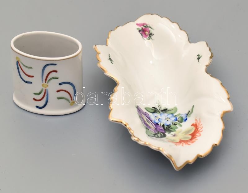Herendi virágmintás porcelán leveles tálka, kézzel festett, jelzett, kis kopásnyomokkal, 15x9 cm + Zsolnay fogpiszkáló tartó, kézzel festet, jelzett, egészen apró kopásnyomokkal, m: 5,5 cm