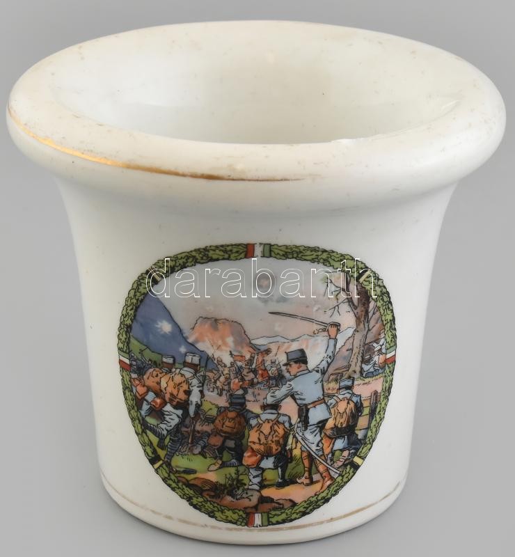 Porcelán mozsár, matricás csata jelenettel, jelzés nélkül, sérült, törő nélkül, m:13cm