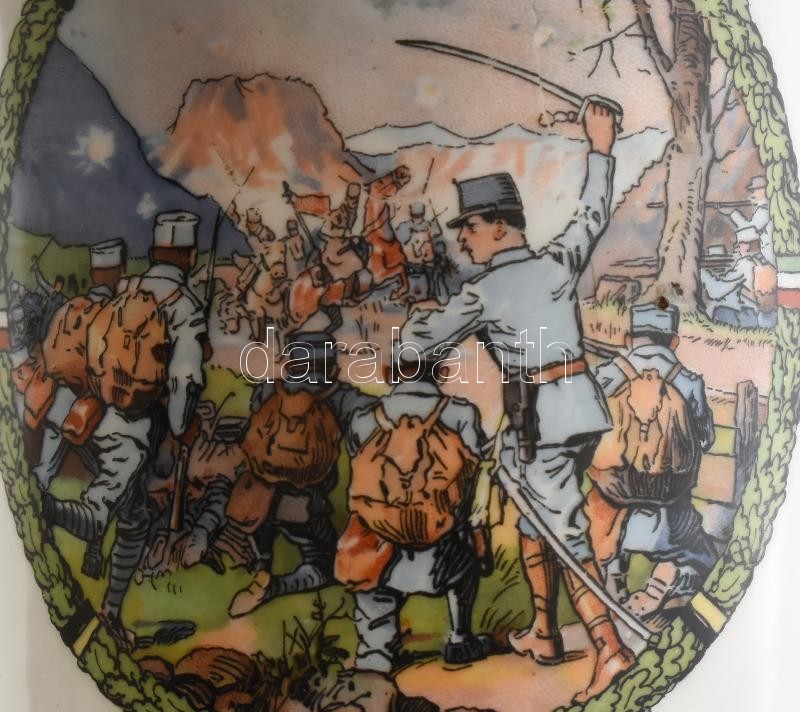 Porcelán mozsár, matricás csata jelenettel, jelzés nélkül, sérült, tör...
