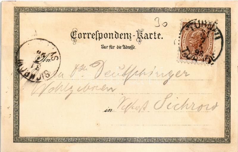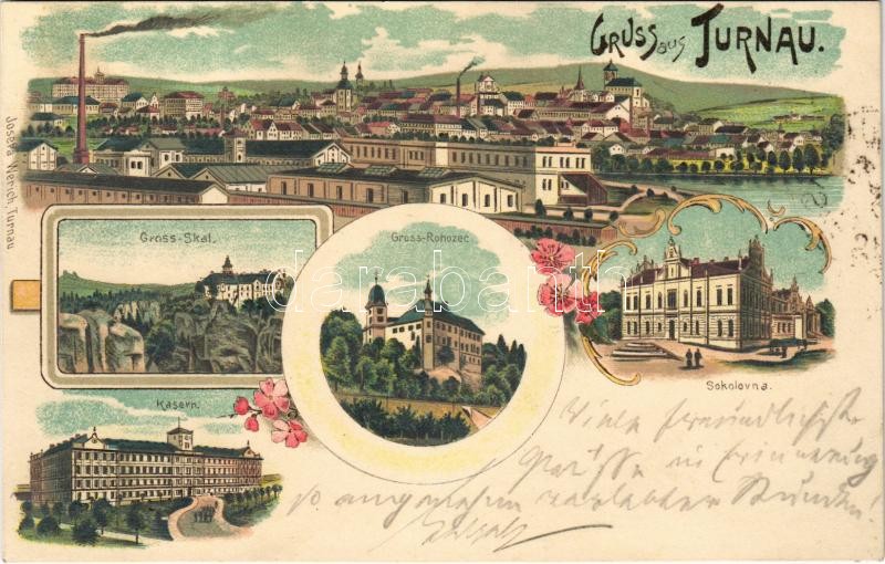1898 (Vorläufer) Turnov, Turnau; Gross-Skal, Gross-Rohozec, Sokolovna, Kasern / general view, castle, Sokol building, military barracks. Josefa Werich Art Nouveau, floral, litho (r)