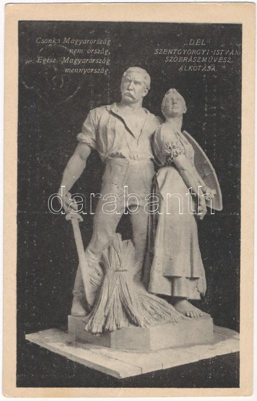 Description: Budapest V. Szabadság tér, Trianon szoborcsoport, irredenta propaganda. "Dél" szobra (Szentgyörgyi István szobrászművész alkotása) A szobrokat a magyar nemzet adakozásából emeltette a Védőligák Szövetsége. Pesti Hírlap kiadása / Hungarian irredenta propaganda, monument (EK)