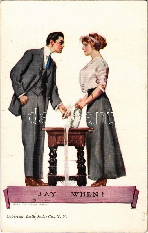 1913 Say when! Lady art postcard, humour. Leslie Judge Co.