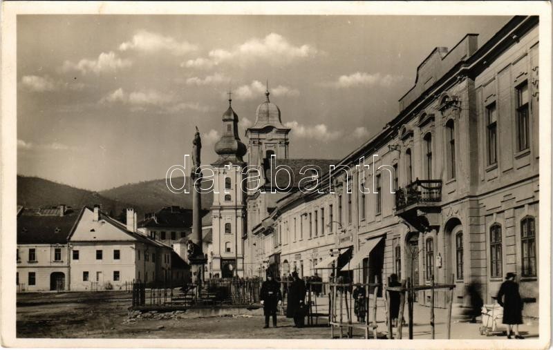 Rozsnyó, Roznava; Rákóczi tér, drogéria, gyógyszertár, üzletek, rendőr / square, pharmacy, shops, policeman