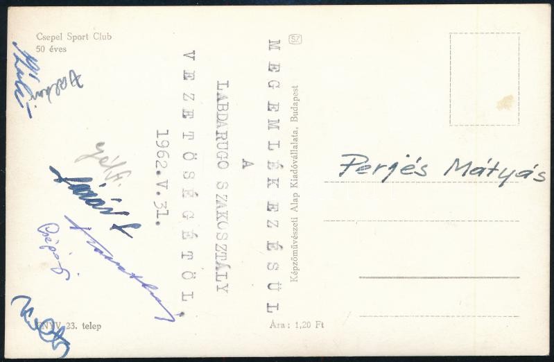 Description: 1962 A Csepel SC labdarúgó szakosztály vezetősége által saját kézzel aláírt megemlékezés Perjés Mátyás focista részére a klub 50 éves jubileumára kiadott képeslapon