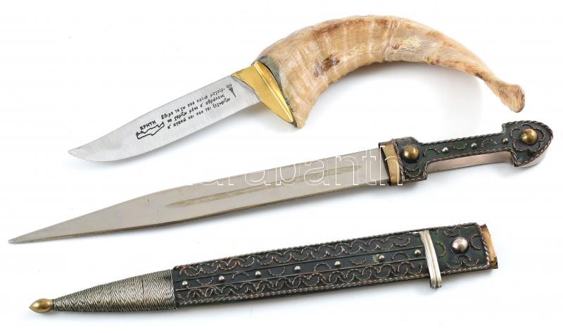 2 db görög és grúz dísztőr: kecskeszarv nyelű, feliratozott pengével, h: 24 cm + kard formájú, díszes fém hüvellyel és markolattal, h: 34 cm