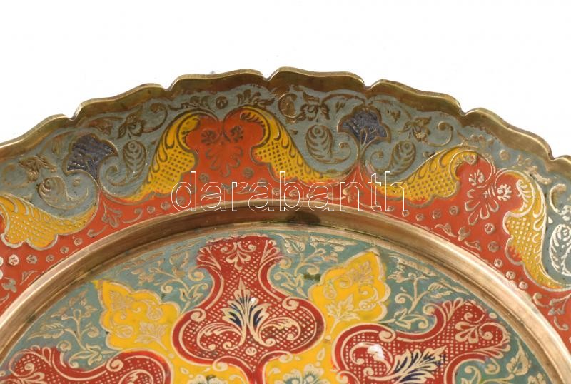 Indiai zománcozott kínálótál, réz, jelzés nélkül, kopott, d:20cm