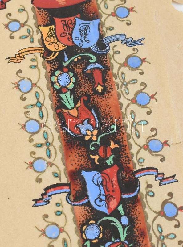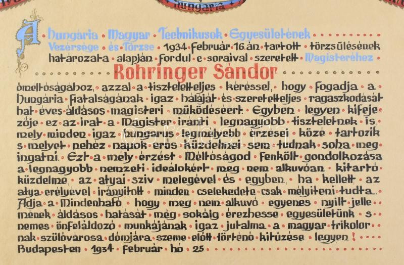 1934 Rohringer Sándor (1868, Kassa-1945, Budapest) vÃzépÃtÅ‘ mérnök, egyetemi tanár, a Magyar Tudományos Akadémia késÅ‘bb rendes tagja részére kiállÃtott egyedi, festett emléklap, végén irredenta szöveggel. A Hungária Magyar Technikusok Egyesületének Vezérsége és Törzse által adományozva, az egyesület cÃmerével dÃszÃtett és 38 autográf aláÃrással, többek közt Tompos ErnÅ‘ (1907-1989) soproni épÃtész, heraldikus és Goszleth Lajos (1906-1963) épÃtész aláÃrásaival. Az emléklap Börtsök László (?-?) grafikus munkája. Tempera, tus, papÃr. Jelezve jobbra lent. Foltos. Lapszéli sérülésekkel. 47x59,5 cm.
