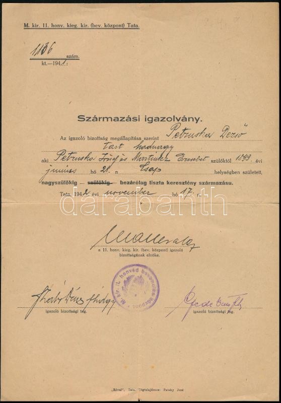 1942 Tata, a M. kir. 11. honvéd bevonulási központ által kiállított származási igazolvány Petruska Dezső tartalékos hadnagy részére
