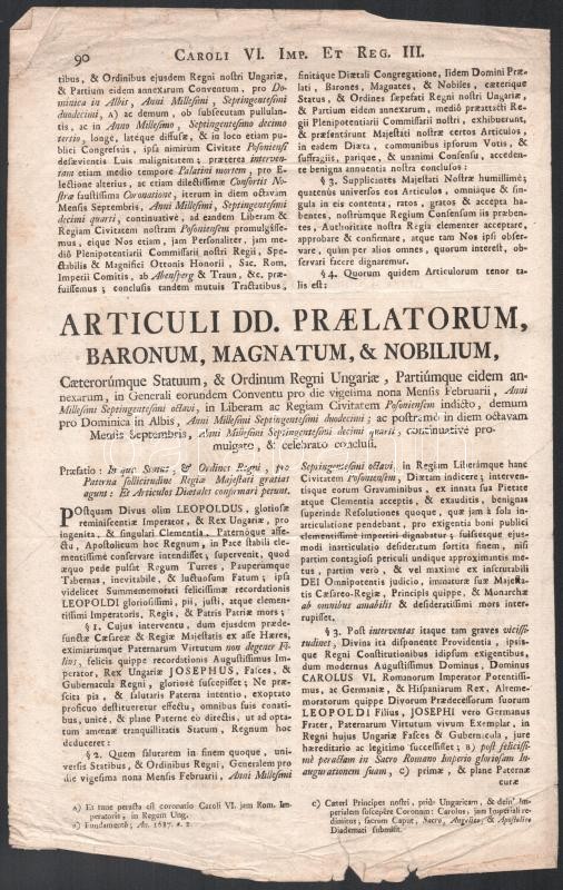 Description: Az 1715. évi törvénycikkek szövege, amelyben VI. Károly német-római császárt Magyarország és a hozzá kapcsolt területek királyává koronázták. Latin nyelven, VI. Károly arcképét ábrázoló metszettel illusztrálva, 2 p., hajtva, a lap szélein kissé sérült.