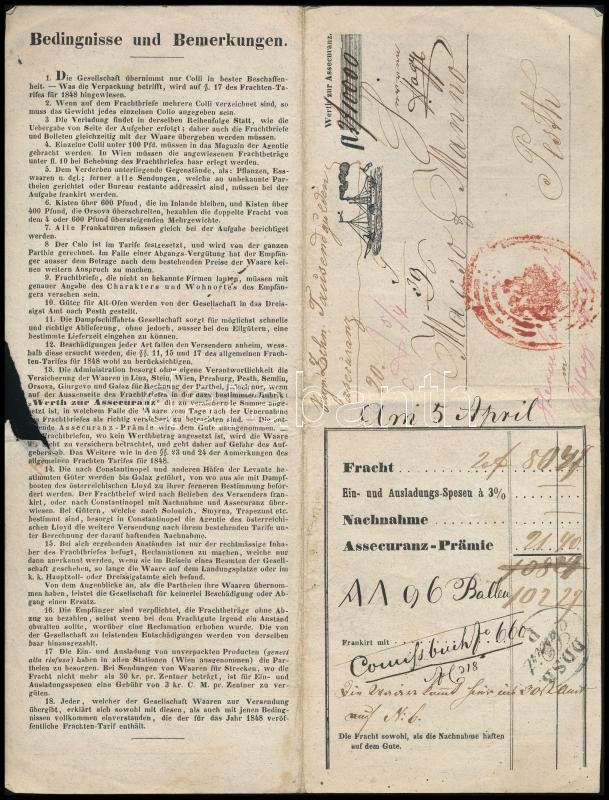 1849 DDSG hajóraklevél Essegről Pestre küldött árukról