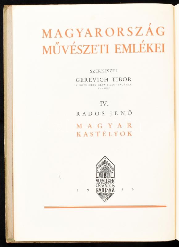 Rados JenÅ‘: Magyar kastélyok. Gerevich Tibor elÅ‘szavával. Magyarország művészeti emlékei IV. köt. Bp.,1939, Műemlékek Országos Bizottsága - Kir. M. Egyetemi Nyomda, 404+1 p. +1(kihajtható térképvázlat) t.+11 (kép mellékletek) t. A 79-394 oldalak között, I-tÅ‘l CLVIII-ig számozott fekete-fehér képtáblával. Gazdag szövegközti fekete-fehér képanyaggal illusztrált. Kiadói félbÅ‘r-kötésben, kopott, foltos borÃtóval, sérült gerinccel.