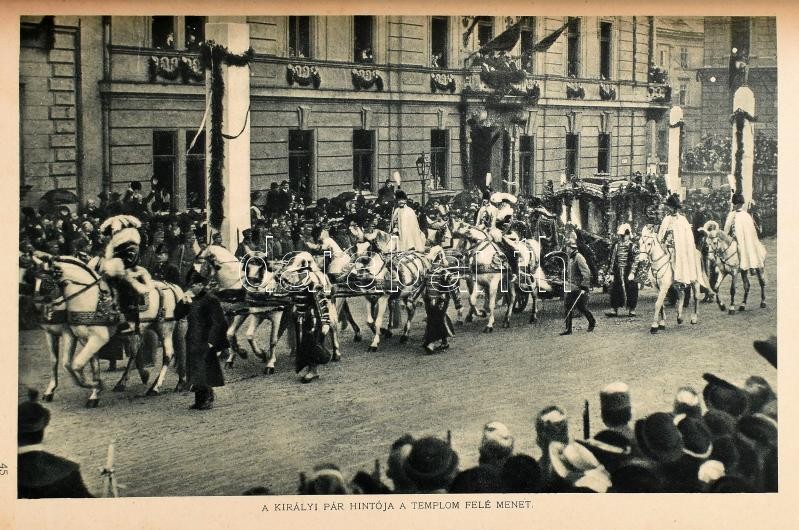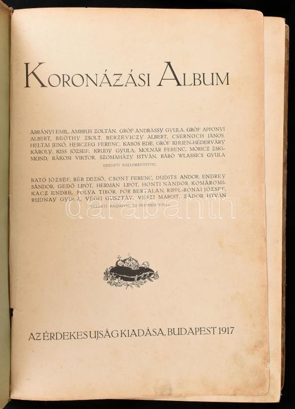 Koronázási album. Ábrányi Emil, Ambrus Zoltán, Gróf Andrássy Gyula, Gróf Apponyi Albert, Beöthy Zsolt, Berzeviczy Albert, Heltai Jenő, Herczeg Ferenc, Kabos Ede, Gróf Khun-Héderváry Károly, Kiss József, Krúdy Gyula, Molnár Ferenc, Móricz Zsigmond, Rákosi Viktor, Szomaházy István, Báró Wlassics Gyula eredeti közleményeivel. Bató József, Bér Dezső, Csont Ferenc, Dudits Andor, Endrey Sándor, Gedő Lipót, Herman Lipót, Honti Nándor, Komáromi-Kacz Emőke, Pólya Tibor, Pór Bertalan, Rippl-Rónai József, Rudnay Gyula, Végh Gusztáv, Vészi Margit, Zádor István eredeti rajzaival és festményeivel. A borító Végh Gusztáv (1889-1973) grafikus munkája. Bp., 1917, Érdekes Újság. Gazdag szövegközti és egész oldalas képanyaggal. Kiadói illusztrált félvászon kötésben, kopott, foltos borítóval, benne foltos lapokkal és kis lapszéli szakadásokkal is.