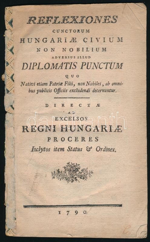 Reflexiones cunctorum Hungariae civium non nobilium adversus illud diplomatis punctum (...). 1790. Papírkötésben, kopottas állapotban.