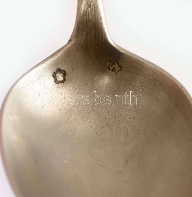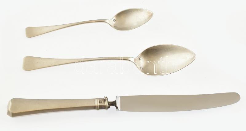 2 db ezüst (Ag) kanál, jelzett, néhány apró horpadással, h: 17,5 cm, 13,5 cm, nettó: 46,5 g + ezüst (Ag) nyelű kés, solingeni acél pengével, kissé sérült, h: 22,5 cm, bruttó: 56 g