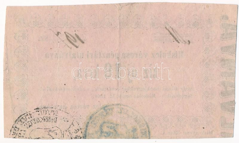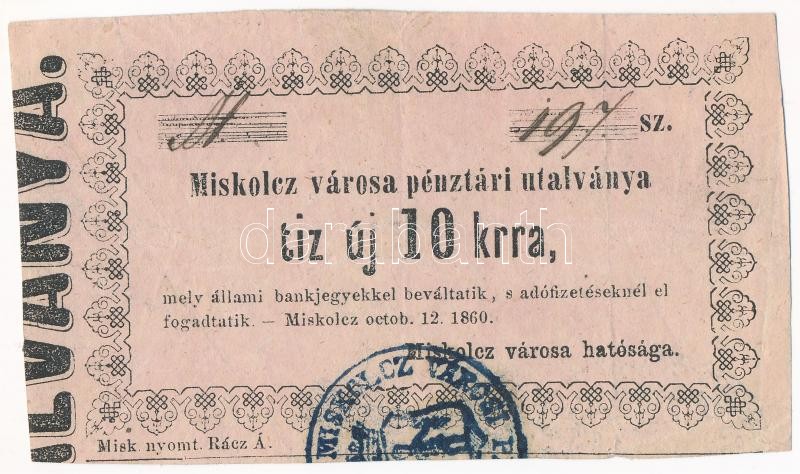 Miskolc 1860. 10kr "Miskolcz városa pénztári utalványa" &quo...