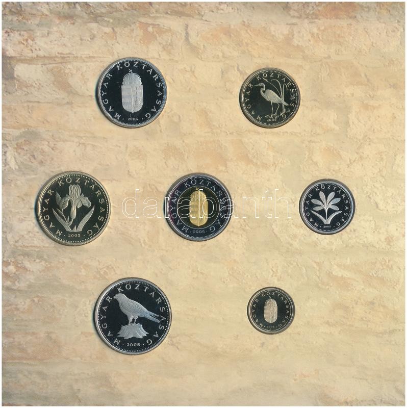 https://www.darabanth.com/en/415-Online-auction/415.0/Numismatics/Hungarian-coins-and-coins-with-Hungarian-mint-marks~2000008/2005-1Ft-100Ft-7xklf-forgalmi-sor-szettben-plus-2005-10Ft-Jozsef-Attila-TPP-patina-Adamo-FO39~II2527269