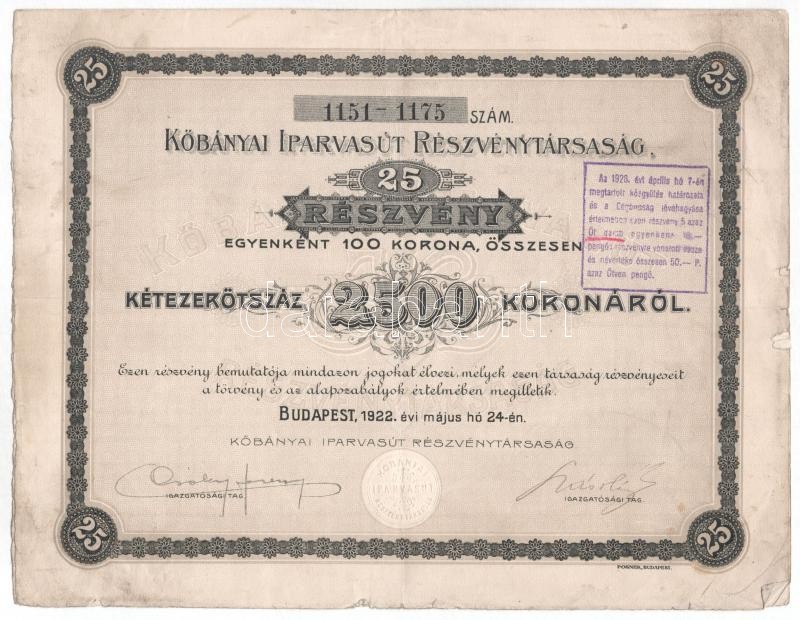 https://www.darabanth.com/en/415-Online-auction/415.0/Numismatics/Shares-and-Tickets~2000005/Budapest-1922-Kobanyai-Iparvasut-Reszvenytarsasag-reszvenye-3xklf-100K-rol-1000K-rC3~II2305566