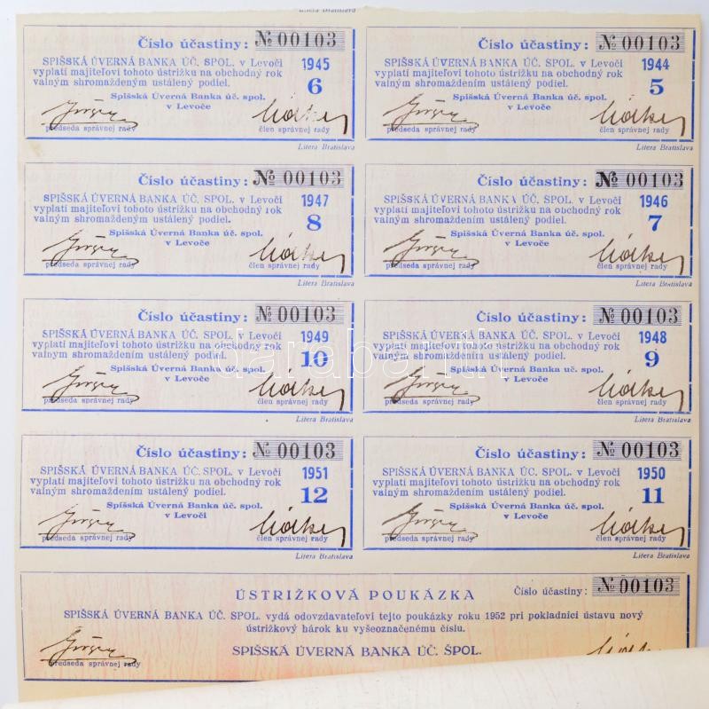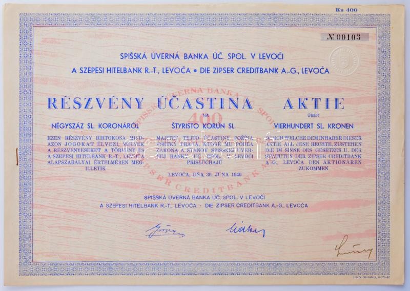 Szlovákia / Lőcse 1940. "Szepesi Hitelbank R.-T., Levoca" részvény 400K-ról, magyar-szlovák-német nyelven, szárazpecséttel, szelvényekkel összetűzve T:I-,II kis szakadások / Slovakia / Levoca 1940. "Szepesi Hitelbank R.-T., Levoca" share about 400 Korun, Hungarian-Slovakian-German trilingual with embossed stamps, with coupons stapled C:AU,XF