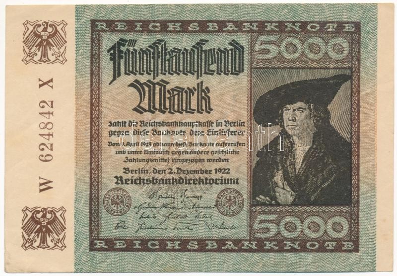 Németország / Weimari Köztársaság 1922. 5000M T:II,II- több kisebb tör... https://www.darabanth.com/en/415-Online-auction/415.0/Numismatics/Worldwide-banknotes~2000014/Nemetorszag-Weimari-Koztarsasag-1922-5000M-TII-II-tobb-kisebb-tores-Germany-Weimar-Re~II2605207
