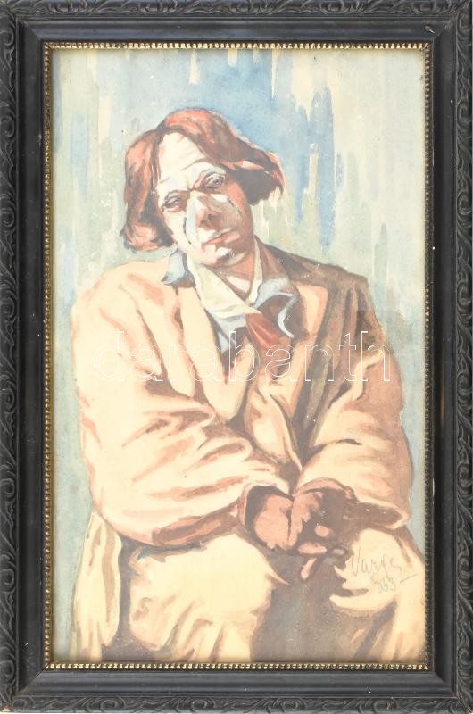 Varga 933 jelzéssel: Bohóc. Akvarell, papír. Dekoratív, üvegezett fa keretben. 37,5x23 cm