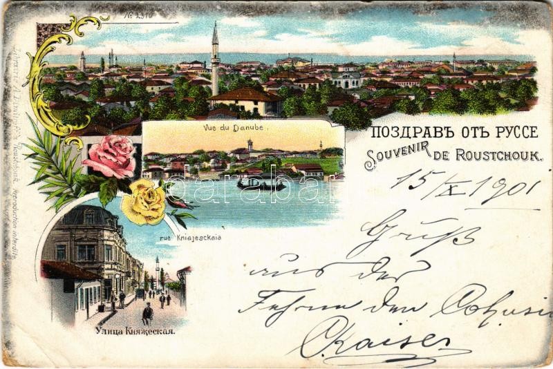 1901 Ruse, Rousse, Russe, Roustchouk, Rustschuk; Vue du Danube, Rue Kniajesckaia / river, street. A. Dimitroff Art Nouveau, floral, litho (EB)