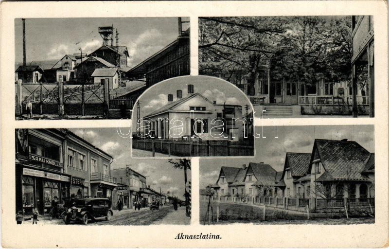 Aknaszlatina, Akna Slatina, Slatinské Doly, Szolotvino, Solotvyno; sóbánya, munkás kolónia, utca, Samu Knoll és Stern üzlete / mine, shops, colony, automobile