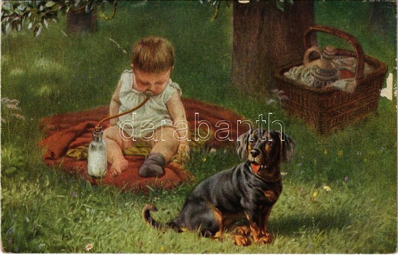 1917 Ein treuer Wächter / Dachshund dog with baby. Deutsche Meister No. 4406. s: Steinmetz-Noris (Rb)