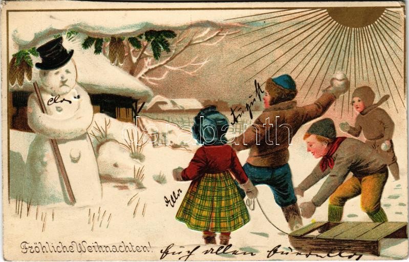 1906 Fröhliche Weihnachten! / Christmas greeting art postcard, snowball fight, children with snowman, sled. Emb. litho (vágott / cut)