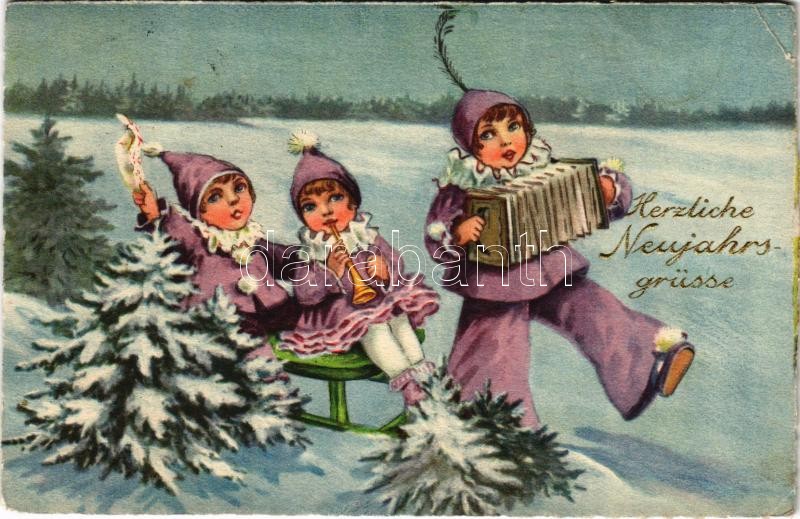 1927 Herzliche Neujahrsgrüsse / New Year greeting art postcard, clowns with sled. WSSB 9909. (EK)