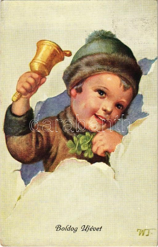 1928 Boldog Újévet! / New Year greeting art postcard, child with bell ...