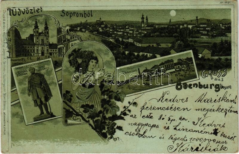 1899 (Vorläufer) Sopron, Ödenburg; Domonkos templom, Fertő tó, Várkerület, Széchenyi István szobor, Szőlős hölgy. Art Nouveau, floral, litho (EK)