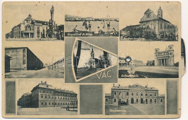 1943 Vác, Rendőrkapitányság és Szentháromság szobor, Strandfürdő, Barátok temploma, Székesegyháza, Fegyintézet, Szeminárium, Vasútállomás. forgatható mechanikus lap (b)