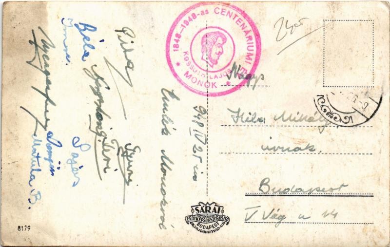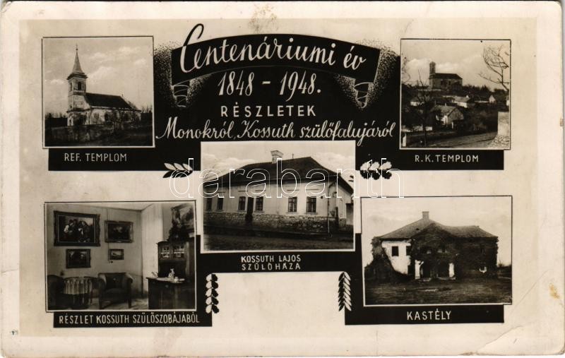 Description: 1948 Monok, Centenáriumi év 1848-1948. Részletek Monokról, Kossuth Lajos szülőfalujából. Református templom, Római katolikus templom, Kossuth Lajos szülőháza, belső, kastély + So. Stpl. (fl)