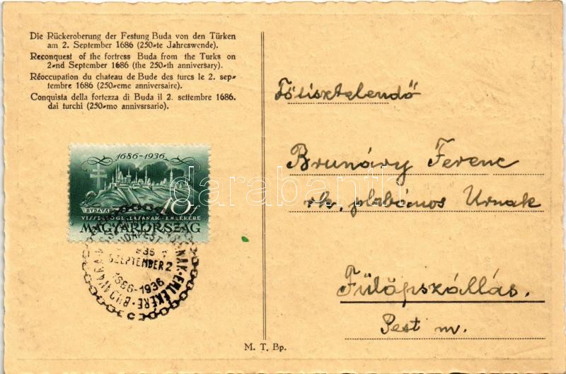 Budapest I. Budavár visszavétele a töröktől 1686. szeptember 2-án 250. évforduló + "1686-1936 Budavára visszafoglalásának emlékére" So. Stpl.