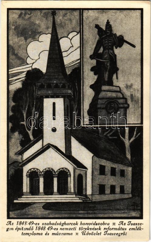 Description: Isaszeg, az 1848-49-es szabadságharcok honvédszobra, emlékmű. Az Isaszegen építendő 1848-49-es nemzeti törekvések református emléktemploma és múzeuma + "1848-1948 Centenáris Verseny Kiállítás 1948. Aug. 20. Isaszeg" So. Stpl. (EK)